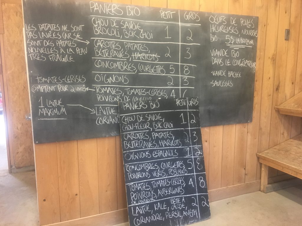 « De mon côté, comme on fait des paniers bio de printemps à la ferme dès le début du mois de mai, on va changer pour une formule « sans contact » où les paniers seront préparés d’avance et déposés directement dans le coffre de l’auto de nos abonnés, au stationnement. […] Je considère cette formule de service à l’auto uniquement pour les paniers bio de printemps, parce que ça commence dans un mois et qu’on va clairement encore être dans le gros de la crise et de la distanciation sociale et qu’on n’a pas encore de lignes directrices claires sur ce qu’on doit faire. Et aussi parce que je veux rassurer les abonnés. […] Pour cet été, je planche sur d’autres solutions parce que ni moi ni mes abonnés n’ont envie du retour aux paniers préassemblés. Du trouble pour nous – ça prend un temps fou à faire – et de l’insatisfaction pour les abonnés – c’est pas tout le monde qui aime le fenouil ou même les betteraves… Alors on est dans l’incertitude, dans l’attente de lignes directrices. Je vais faire ça pour les paniers de printemps (40 abonnés), mais ce n’est pas encore décidé pour la saison principale (presque 400 abonnés). »